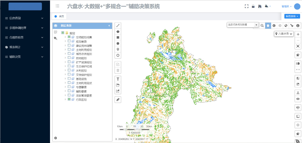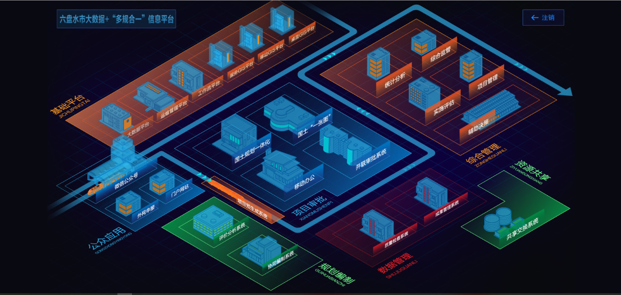 六盘水大数据+“多规合一”信息平台,主要面向公众提供在线项目申报、选址服务,面向规划职能部门提供规划编制、空间协调、项目审批、综合监管、资源共享等服务,并利用大数据技术,汇集了各相关部门的规划数据,形成空间规划一张蓝图。